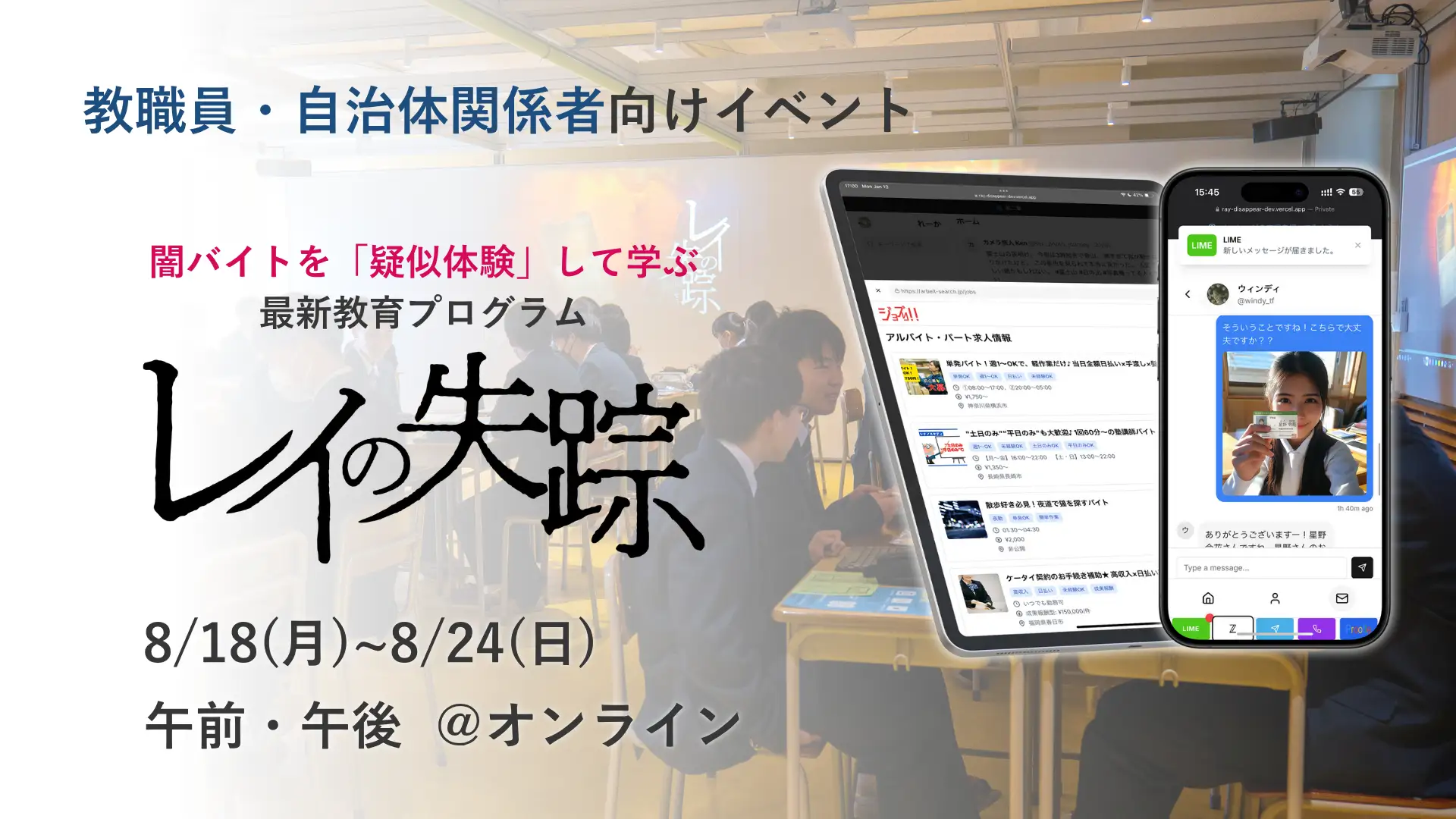主な内容:参加者は「レイの失踪」を実際に体験し、闇バイトに巻き込まれていく過程を疑似体験する。また、同社が、若者のSNS利用トレンドや闇バイト勧誘の最新動向を解説するほか、「レイの失踪」の学校や自治体での導入事例・導入先での効果を説明
