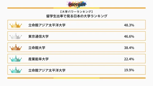 ポップコーンは、メディア「大学パワーランキング」にて、『留学生比率で見る日本の大学ランキング』を8月1日に公開した。