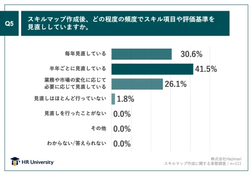 スキルマップ導入後は、9割以上が「人材育成に活かされていると実感している」と回答した。また、スキルマップ作成後のスキル項目や評価基準の見直し頻度を訊ねたところ、「半年ごと」が最も多く4割以上、「毎年」も3割に上った。