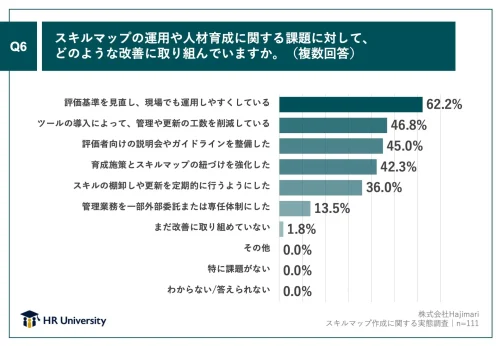 スキルマップの運用や人材育成に関する課題を複数回答で訊ねたところ、1位「評価基準を見直し、現場でも運用しやすくしている」が62.2%で最も多く、次いで「ツールの導入によって、管理や更新の工数を削減している」「評価者向けの説明会やガイドラインを整備した」と続いた。