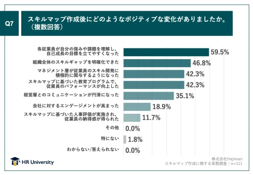 また、スキルマップ作成後のポジティブな変化を訊ねたところ、約6割が「各従業員が自分の強みや課題を理解し、自己成長の目標を立てやすくなった」と回答した。