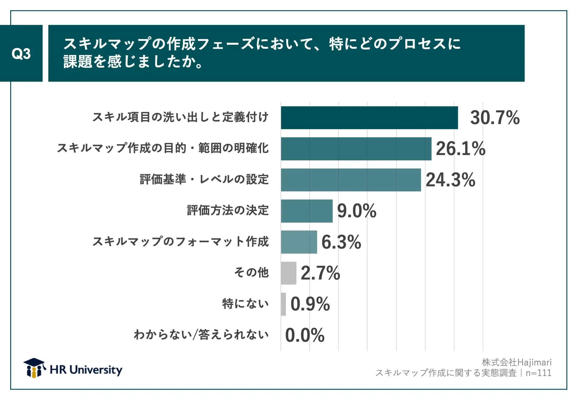 スキルマップの作成にあたっては半数以上が「一部外部の支援を受けて作成した」と回答。スキルマップ作成時の課題は、1位「スキル項目の洗い出しと定義付け」30.7%、2位「目的・範囲の明確化」26.1%となった。