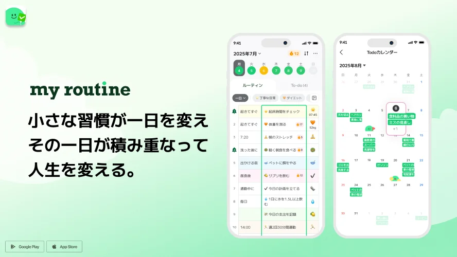 「マイルーティン」は、日々のルーティン習慣の管理に加えて、ToDo、メモ、日記、目標管理まで全てこのアプリ一つで行える、統合型の1日管理アプリ。生産的な毎日を支えるツールとして設計されている。