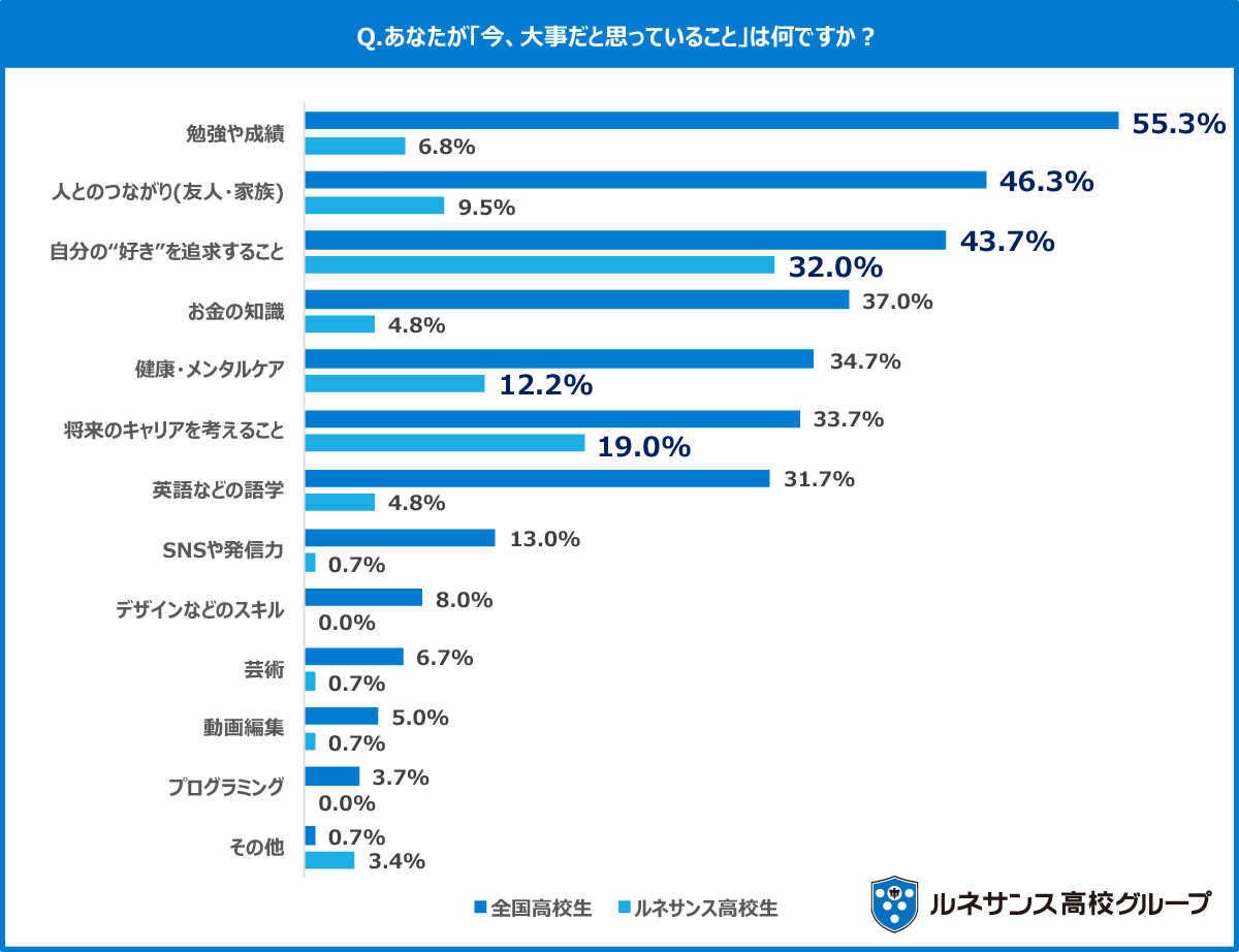 現役高校生に「今、大事だと思っていること」を聞いたところ、「勉強や成績」が55.3%で最も高く、次いで「人とのつながり(友人・家族)」が46.3%、「自分の”好き”を追求すること」が43.7%と、勉強や人間関係以外にも自分の好きなことを追い求める姿勢があるということがわかった。