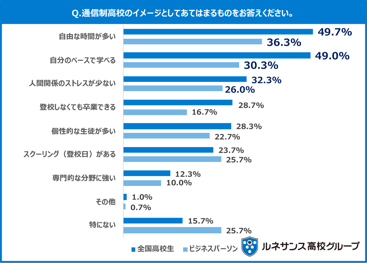 ルネサンス高校グループは15日、全国の20~30代のビジネスパーソン300人と全国の現役高校生300人、ルネサンス高校グループの在校生(任意の生徒のみ)147人を対象に実施した、「大人と高校生747人が語る、”未来につながる学び”」の調査結果を発表した。