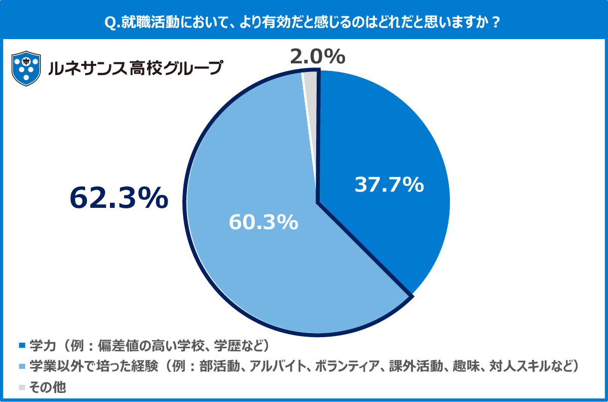 「学力(例:偏差値の高い学校、学歴など)」が37.7%であるのに対し、「学業以外で培った経験(例:部活動、アルバイト、ボランティア、課外活動、趣味、対人スキルなど)」「その他」が62.3%と、5人中3人が学業以外の経験の方が就職活動において有効だと感じていることがわかった。
