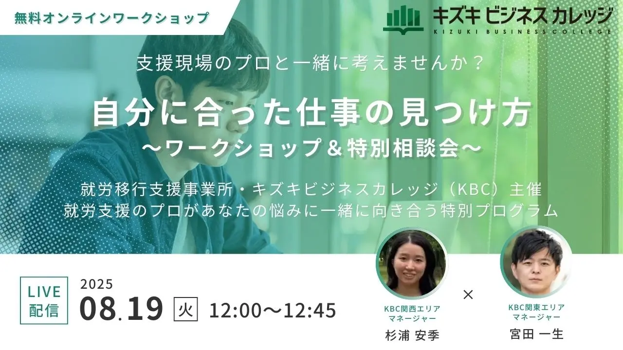 キズキは、同社が運営する就労移行支援事業所「キズキビジネスカレッジ」(KBC)の主催で、8月19日に、「自分に合った仕事の見つけ方」をテーマにした無料オンラインワークショップを開催する。