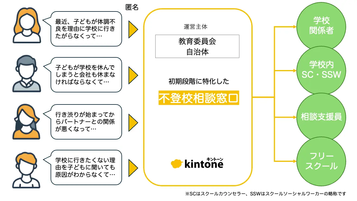 具体的には、自治体や教育委員会が、匿名で利用可能な「不登校相談窓口」をkintone上に構築する。保護者は名前を出さない方法も選べ、安心して相談でき、学校や専門家とつながることで子どもや家庭に合ったアドバイスが受けられる。