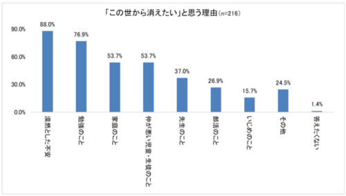 「この世から消えたい」と感じる理由に多く挙げられた回答は「漠然とした不安」88.0%、「勉強のこと」が76.9%。