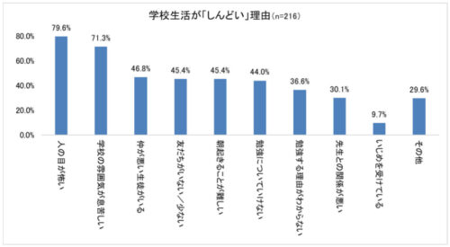 「学校がしんどい理由」に多くあげられた回答は「人の目が怖い」が79.6%、「学校の雰囲気が息苦しい」が71.3%だった。
