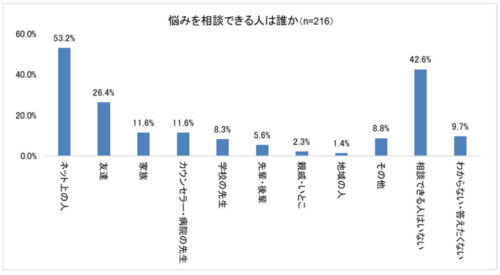 「悩みを相談できる人」について、最多の回答は「ネット上の人」で53.2%、「相談できる人はいない」は42.6%だった。