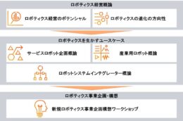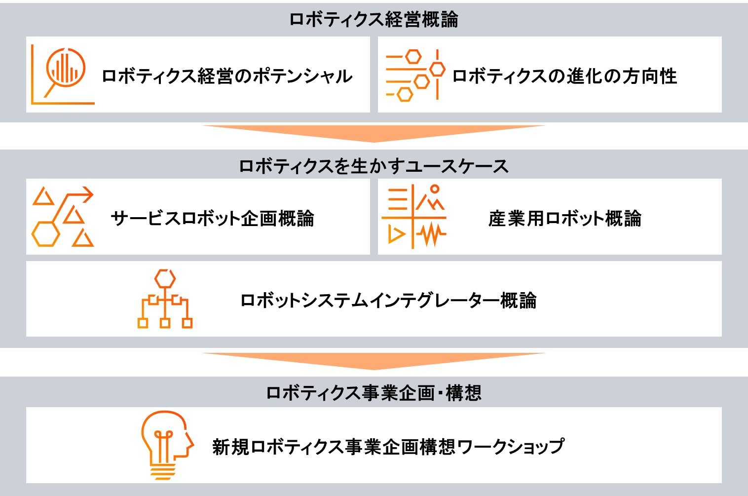 同講座は、ロボティクス経営概論、ロボティクスを生かすユースケース、ロボティクス事業企画・構想の3つのセクション、全8回で構成される。