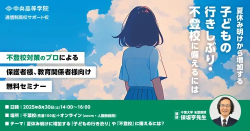 ディー・エヌ・ケーが運営する通信制高校サポート校・中央高等学院は、不登校対策の専門家や体験者を招いた無料セミナーを8月30日に千葉校で開催する。