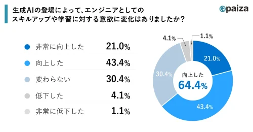 生成AIの登場による学習意欲の変化については、「非常に向上した」「向上した」が64.4%。「非常に低下した」「低下した」は僅か5.5%で、「プログラミングスキルが不要になるのでは」という世間のイメージとは反対に、現場ITエンジニアの学習意欲は高まっている。