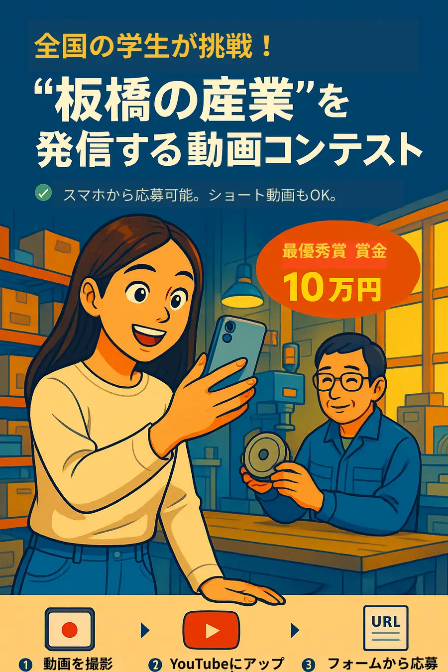 募集テーマは「板橋の産業を感じる瞬間」。応募はスマートフォン1台から可能。短編ドキュメンタリーやショート動画、ルポ、Vlogなど形式は自由。生成AIを活用した作品も申告のうえ応募できる。