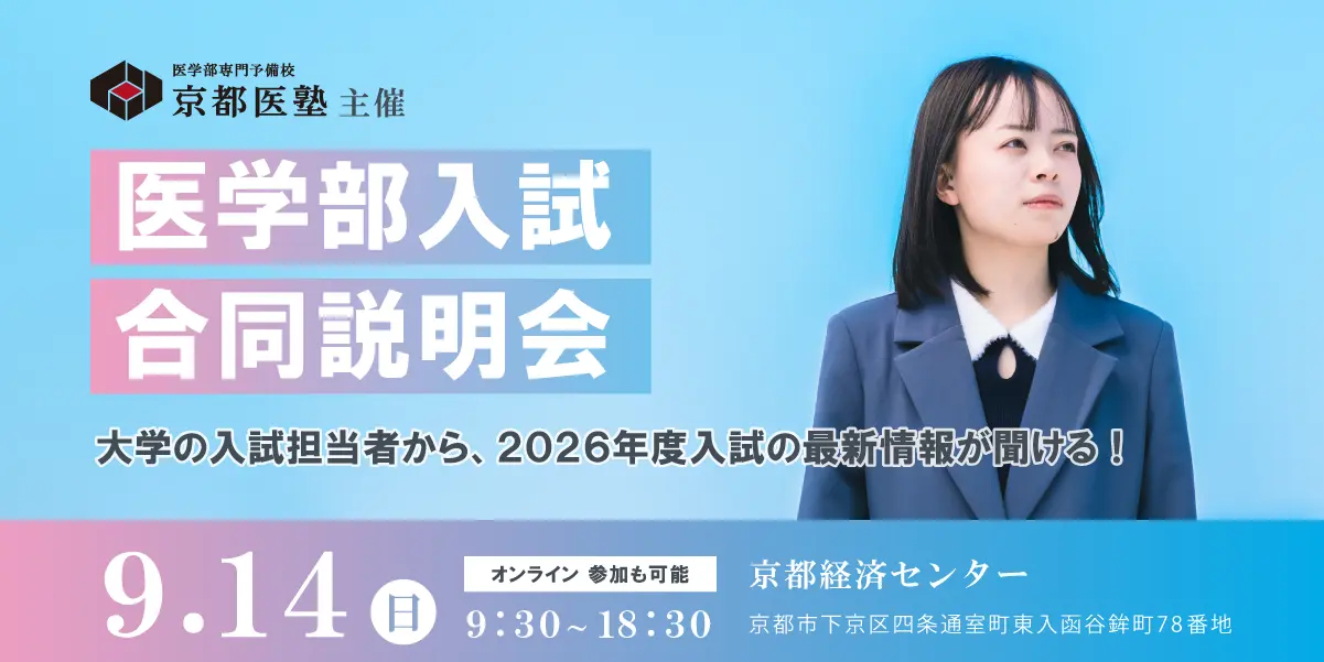 医学部専門予備校「京都医塾」は、医学部医学科進学をめざす中高生・高卒生、その保護者を対象にした「医学部入試合同説明会」を、京都経済センターとオンライン配信のハイブリッド形式で9月14日に無料開催する。