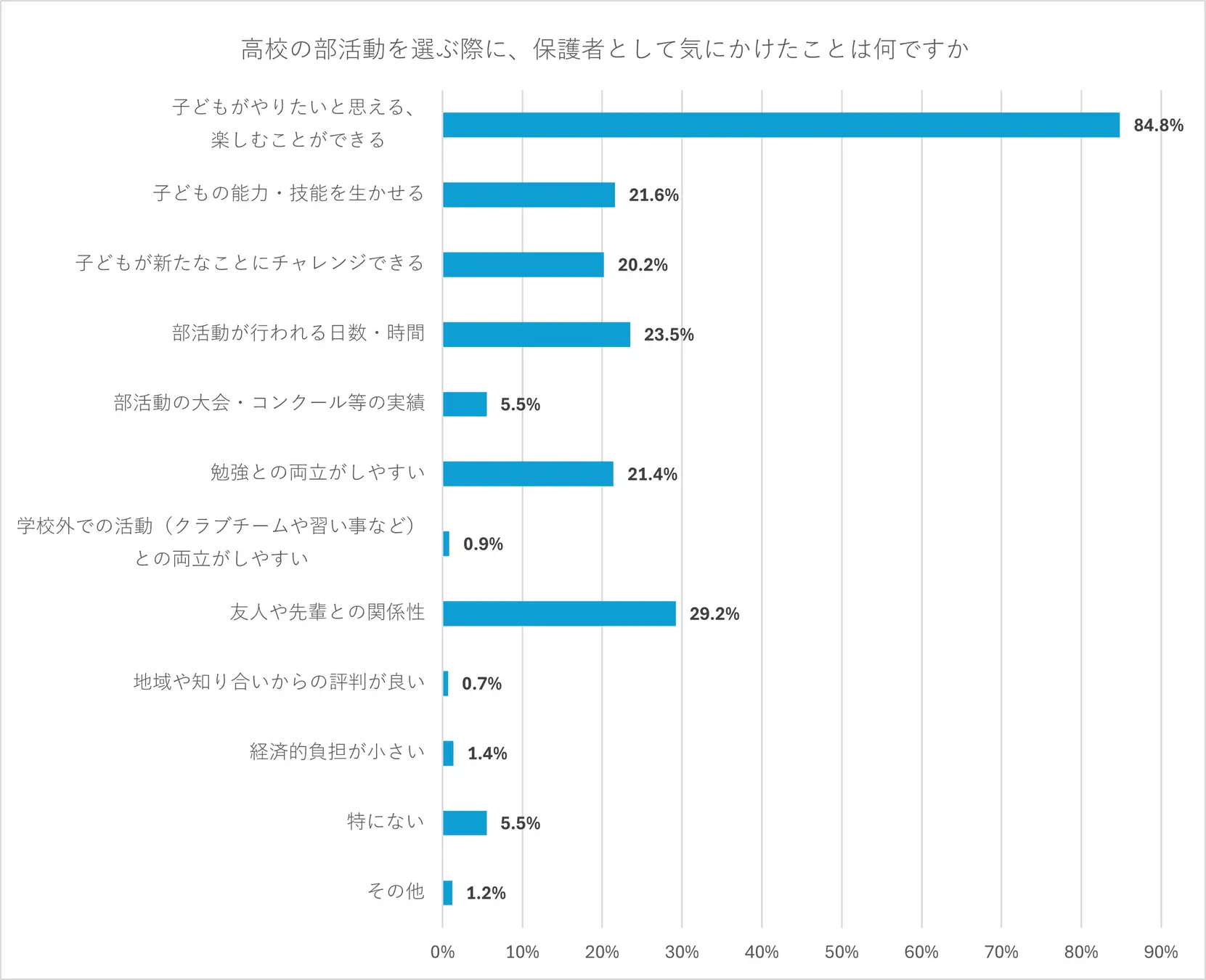 子どもが部活動を選ぶ際に、保護者が気にかけたことを尋ねたところ、最も多かったのは「子どもがやりたいと思える、楽しむことができる」で84.8%にのぼった。次いで「友人や先輩との関係性」が29.2%だった。