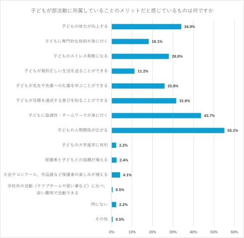 また、子どもが部活動に所属しているメリットについて保護者に聞いたところ、「子どもの人間関係が広がる」が最も多く55.1%、次いで「子どもに協調性・チームワークが身に付く」が43.7%だった。「子どもの体力が向上する」「子どもが目標を達成する喜びを知ることができる」も、3割以上の保護者が、部活動に所属しているメリットと回答した。