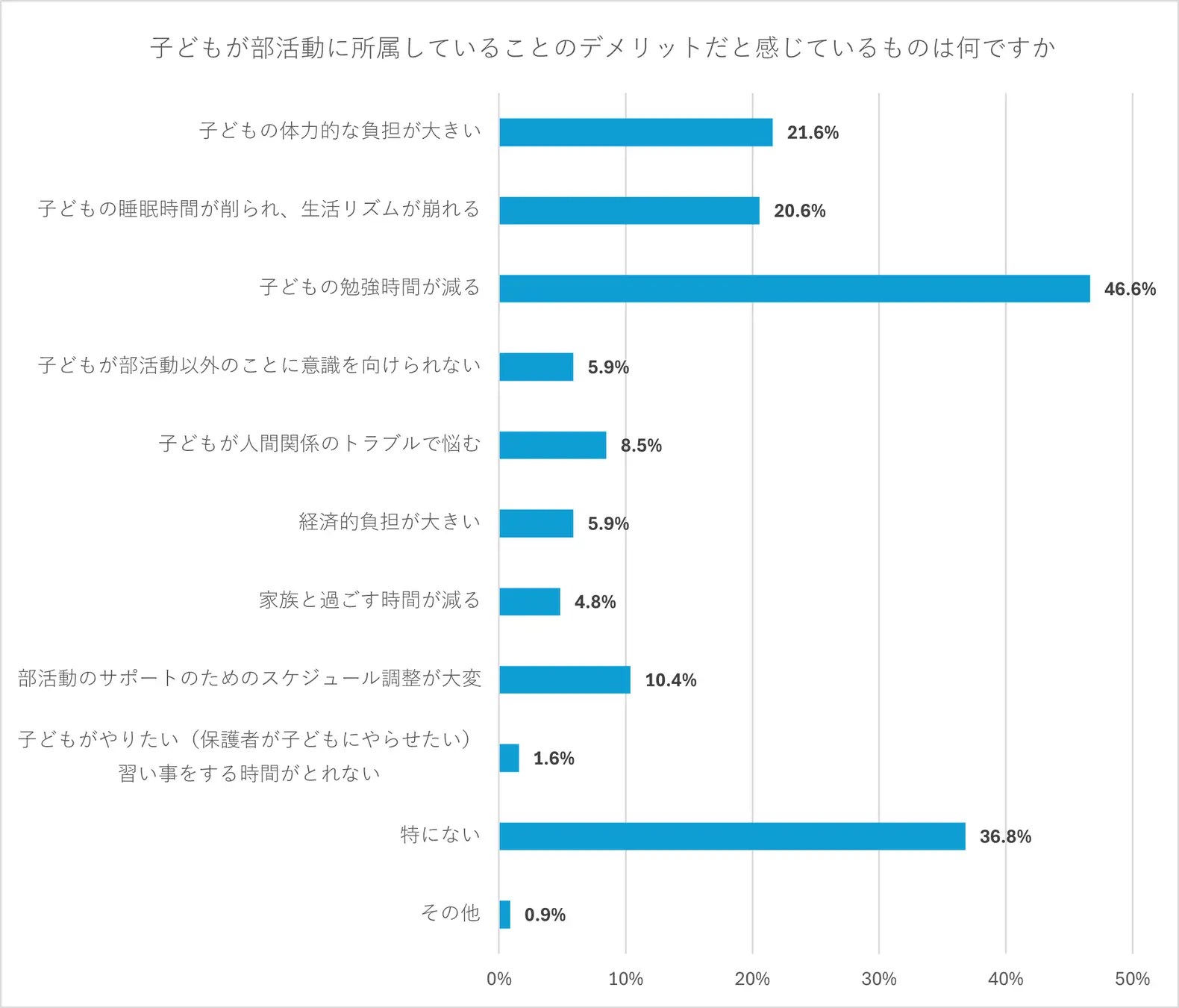 一方、部活動に所属しているデメリットについて聞いたところ、最も多かったのは「子どもの勉強時間が減る」で46.6%、次いで「特にない」が36.8%だった。部活動で勉強時間が減ってしまうことを気にかける保護者が多いものの、特にデメリットを感じていない保護者も少なくないことが分かった。