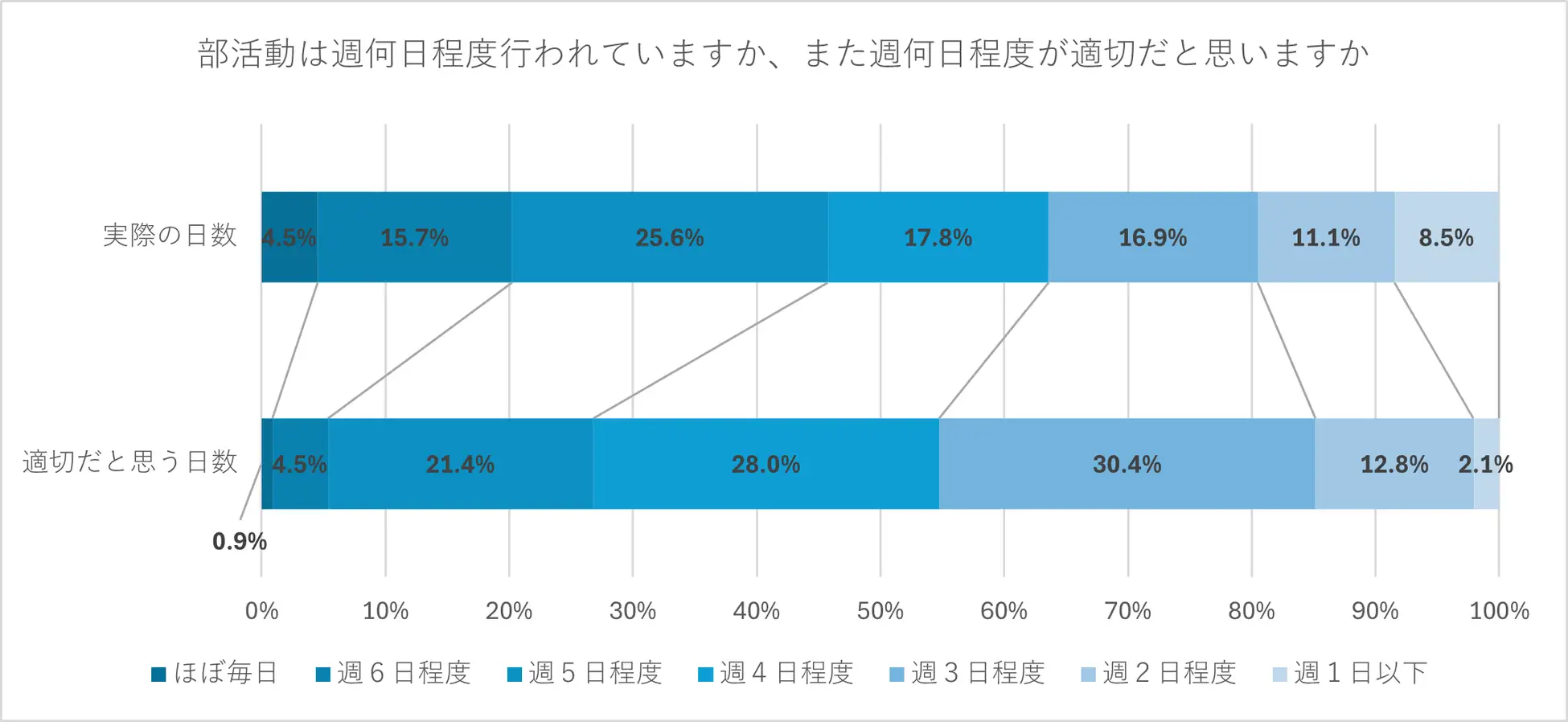 2023年5月に実施した同調査と比較すると、部活動の実際の活動日数は、「週3日程度」が17.2%⇒16.9%、「週4日程度」が17.7%⇒17.8%、「週5日程度」が24.9%⇒25.6%。その他の実際の活動日数の割合も1ポイント未満の変動で、全体の傾向に大きな変化は見られなかった。
