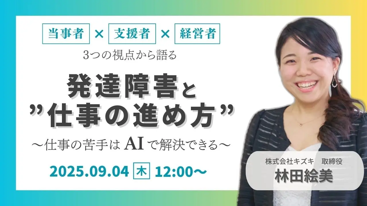 当日は、発達障がいの当事者・支援者・経営者という3つの視点を持つ同社取締役・林田絵美氏らが講師として登壇。仕事の苦手を克服するための手段としてAI・ITツールに着目し、新しい「仕事の進め方」の可能性などについて分かりやすく語る。