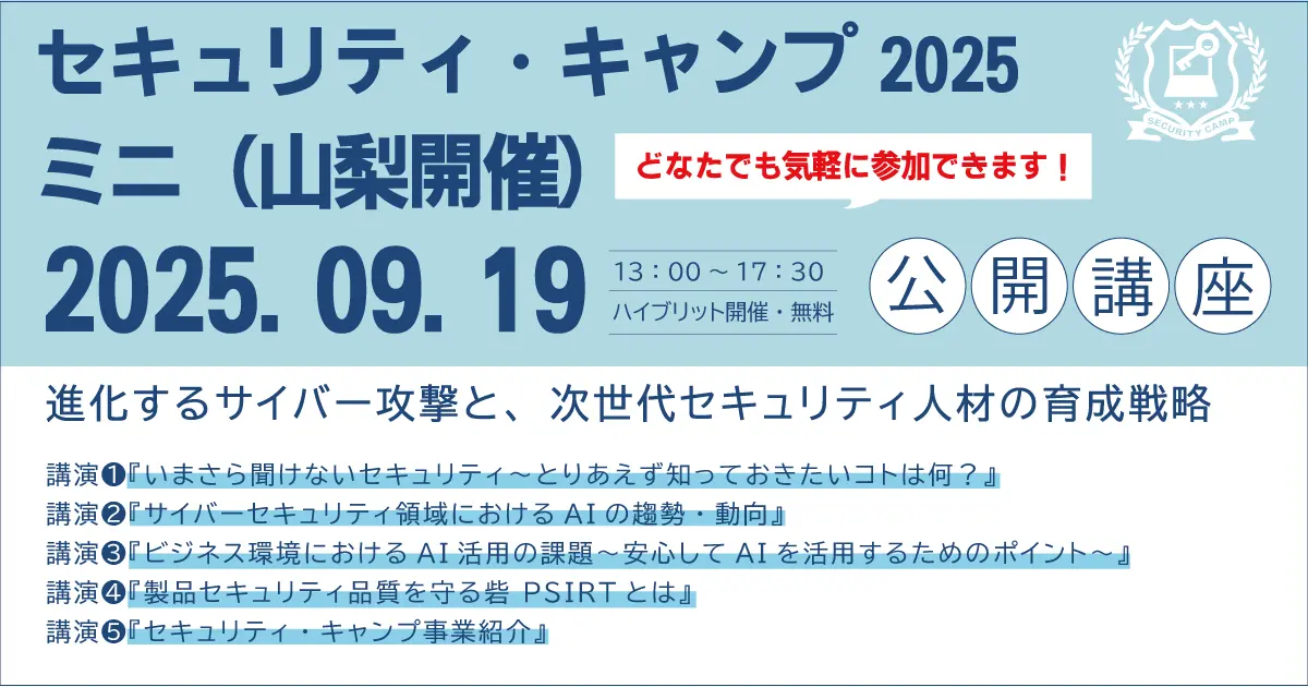 セキュリティ・キャンプ協議会は、山梨ICT&コンタクト支援センター、山梨大学と「セキュリティ・キャンプ2025ミニ(山梨開催)」の公開講座を9月19日に開催する。