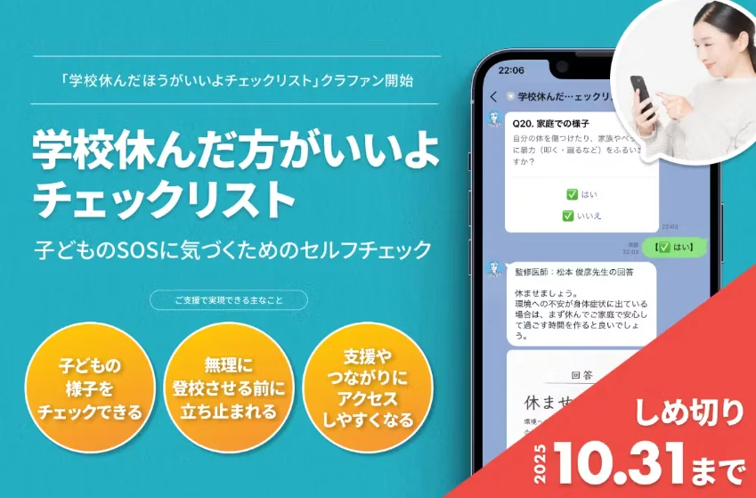キズキは8月29日、「学校休んだほうがいいよチェックリスト」の無料提供継続に向けたクラウドファンディングを開始した。