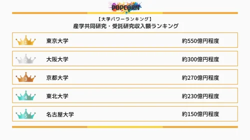 ポップコーンは8月31日、Webメディア「大学パワーランキング」で「【2025年度最新版】国内大学の産学共同研究・受託研究収入額ランキング」を公開した。
