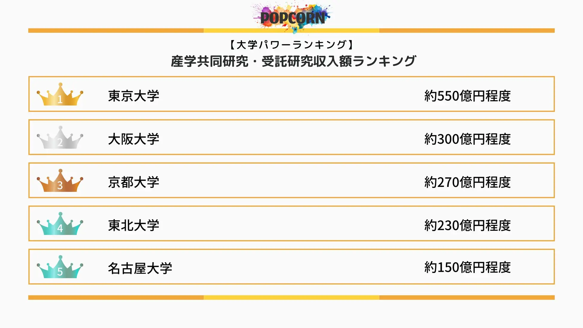 ポップコーンは8月31日、Webメディア「大学パワーランキング」で「【2025年度最新版】国内大学の産学共同研究・受託研究収入額ランキング」を公開した。