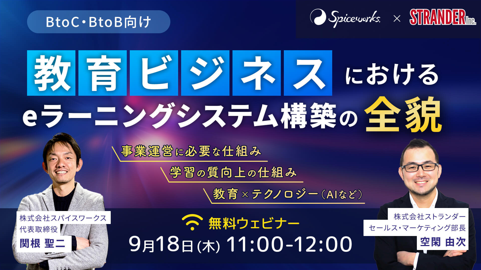 ストランダ―は、スパイスワークスと共催で「BtoC・BtoBの教育ビジネスにおけるeラーニングシステム構築」をテーマにした無料ウェビナーを9月18日に開催する。
