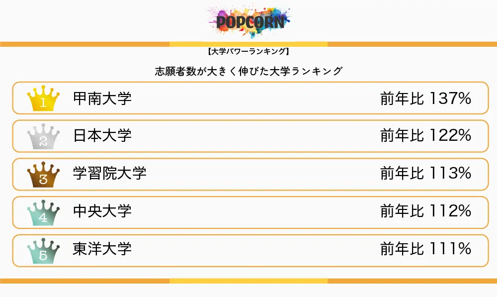 ポップコーンは1日、「大学パワーランキング」で「2025年度入試 志願者数大幅増加大学ランキング」を公開した。