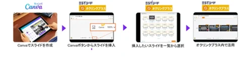 今回の連携機能では、優れたグラフィックデザイン機能を持ち小中学校での活用も多いCanvaで作成したスライドを、オクリンクプラス内でシームレスに活用でき、さらに、Canvaで作成した成果物の管理をミライシード内で行うこともできるようになる。