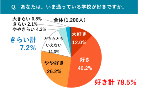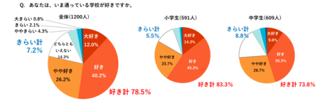 それによると、小中学生の約8割は、いま通っている学校が「好き」と回答。「好き」と「きらい」の分かれ目は、クラスや友だち、 先生などとの関係性があることがわかった。