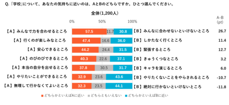 学校は「みんなで力をあわせるところ」が6割、「行くのが楽しみなところ」が5割。一方で「絶対に行かないといけないところ」「やりたくないことをやらされるところ」も4割と、複雑な気持ちが見え隠れしていた。