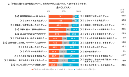 学校についての意見では、修学旅行は8割、運動会は7割が「あったほうがいい」と学校行事には前向き。一方、 勉強は「みんなと同じ」より「自分の好きなことを」「自分の好きなペースで」が上回る結果となった。