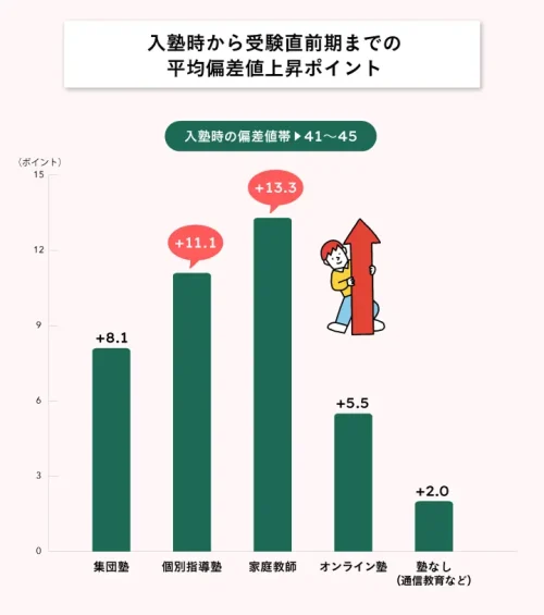 調査は、過去5年以内に中学受験(一般入試)を経験した子どもの保護者433名を対象に、7月25日~8月7日に行われた。それによると、「個別指導塾」「家庭教師」を利用した子どもたちが、入塾時からの偏差値を大きく伸ばし(+10以上)、高い志望校合格率(80%以上)を達成していることが明らかとなった。
