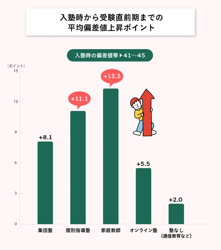 また、「集団塾」はどの偏差値帯においても平均して偏差値が5~8ポイント上昇し、安定した成績向上を実現した。特に高偏差値(50以上)の子どもに効果が確認された。