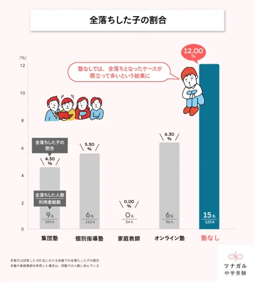 「塾なし受験」では、全落ちした子どもの割合が12%と、他の学習スタイルと比較して最も高い結果となった。