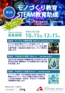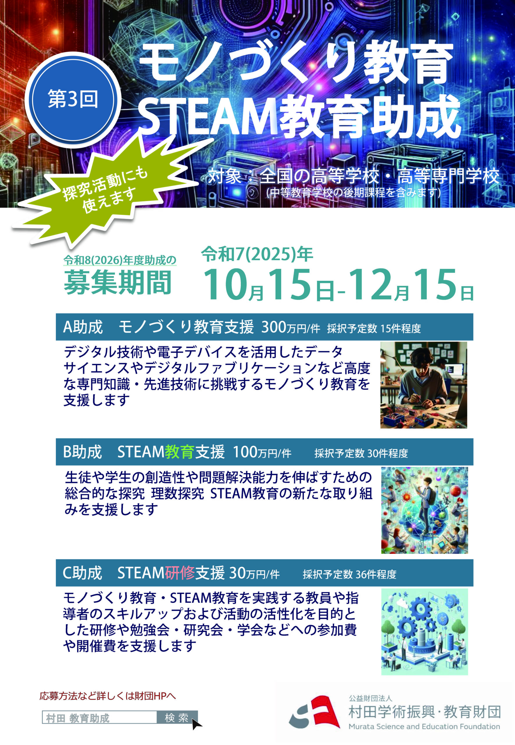村田学術振興・教育財団は、第3回「モノづくり教育・STEAM教育助成」の募集を10月15日から開始する。