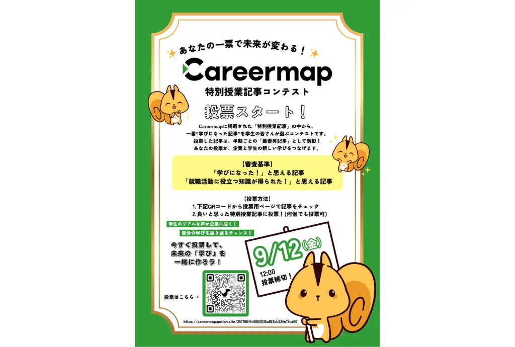 企業・学校関係者、専門学生を対象に、Careermapに掲載された特別授業記事の中から「もっとも学びにつながると思う記事」を選んでもらう投票を実施している。投票12日12:00まで。10月1日に結果発表を予定している。