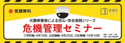 危機管理コンサルティングは、元警察署長が現場で培った経験と最新の犯罪・事故傾向を踏まえた「実践的危機管理セミナー」を9月10日から3回にわたり無料開催する。