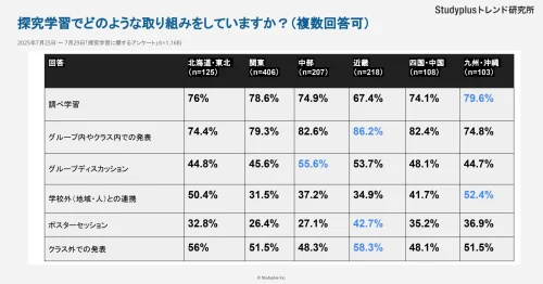 また、近畿は他の地方と比較して「調べ学習」の数値は低くかったが、「発表(クラス内・クラス外ともに)」や「ポスターセッション」は高かった。