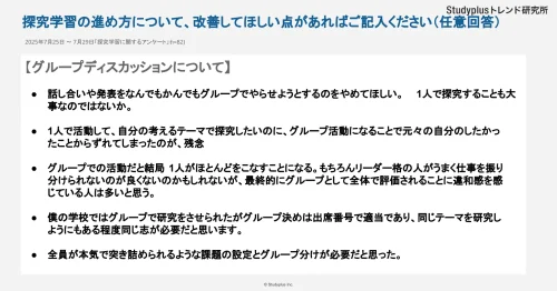 探求学習の進め方について、「改善してほしい点」を尋ねたところ、「グループディスカッション」に対して「グループ活動になることで自分のしたかったことからズレてしまう」「グループ全体で評価されることに違和感を感じる」といった意見や、「グループ決めが出席番号で適当」といったグループの振り分け方に関する声が寄せられた。