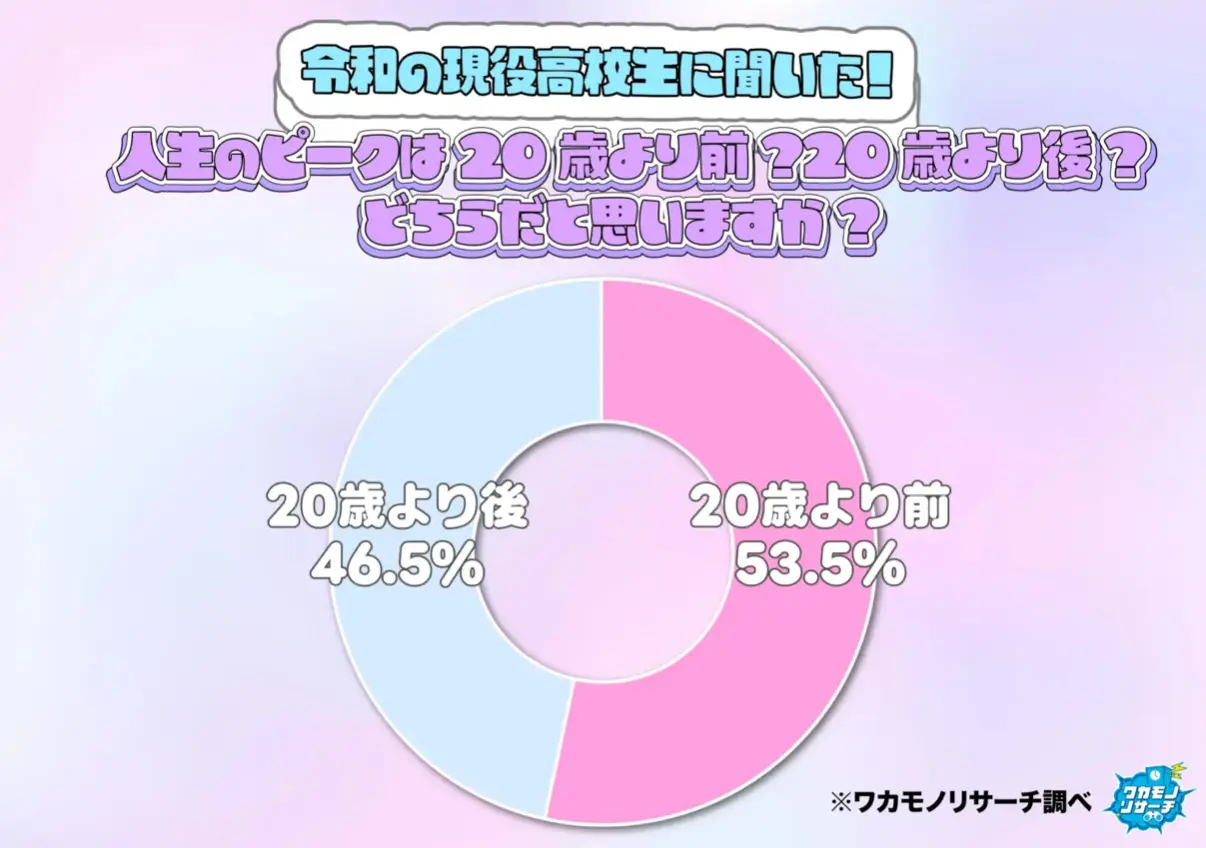 人生のピーク、現役高校生の53.5%が「20歳より前」と回答=ワカモノリサーチ調べ=