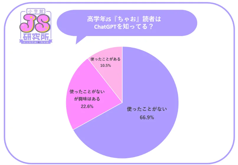 まず、「ちゃお」6月号アンケートで、最新の生成AIであるChatGPTの利用状況について調べたところ、JSの10.5%が「使ったことがある」と回答。「使ったことはないが興味はある」22.6%と合わせると、約3人に1人のJSが関心を持っていることが分った。