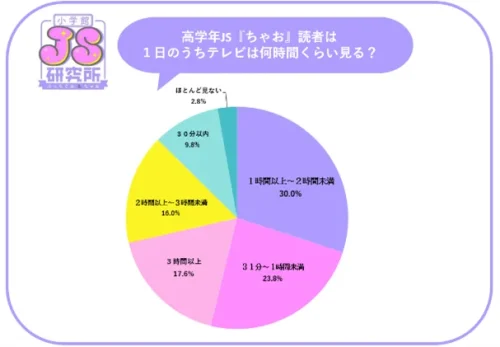 また、「ちゃお」6月号BIGアンケートで、1日のTV視聴時間を聞いたところ、「1時間以上〜2時間未満」30.0%が最多で、「2時間以上〜3時間未満」16.0%と、「3時間以上」17.6%を合わせると、実に63.6%のJSが毎日1時間以上テレビを視聴していることが分った。他方、「ほとんど見ない」と回答したのはわずか2.8%だった。
