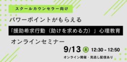 日本公認心理師ネットワークは、スクールカウンセラー向け「援助希求行動(助けを求める力)」心理教育オンラインセミナーを9月13日に開催する。