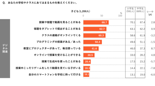 また、「プログラミングの授業がある/あった(50.3%)」「授業で生成AIを使ったことがある(20.4%)」と、新たなデジタルスキル習得に向けた授業の導入が進みつつあるようす。小学生/中学生別で見ると、小学生は中学生より「教室にプロジェクターがあって、毎日使っている」が8.7pt高い。