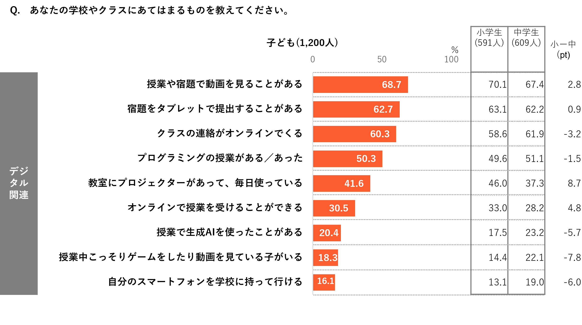 子どもたちに、通っている学校にあてはまるものを聞いたところ、「授業や宿題で動画を見ることがある(68.7%)」、「宿題をタブレットで提出することがある(62.7%)」 「クラスの連絡がオンラインでくる(60.3%)」など、学校教育や学校生活においてデジタル化が着実に進んでいる様子がうかがえた。