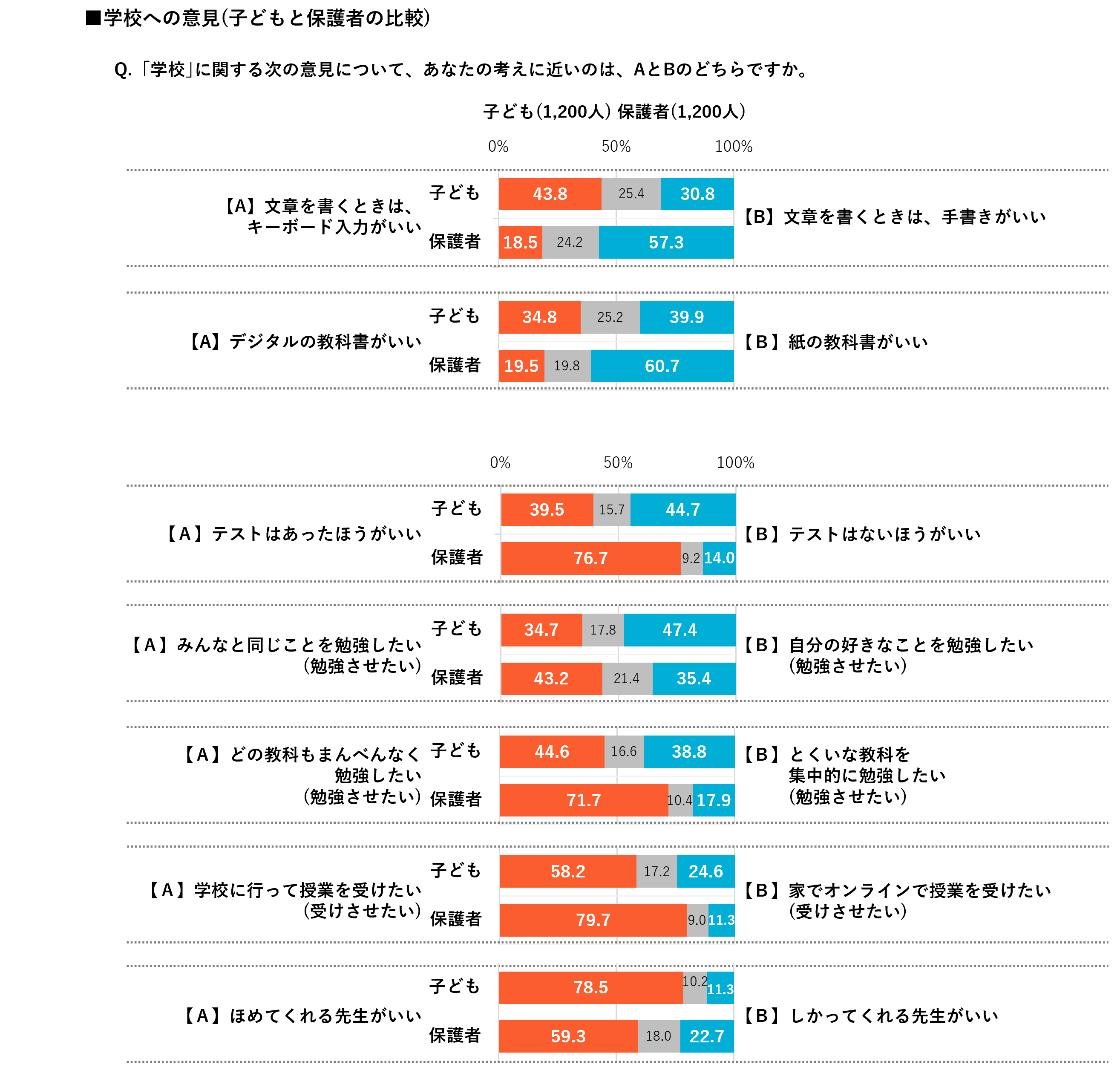 その他に、2つの項目で子どもと保護者の意見が逆転。「テストはあったほうがいい/ないほうがいい」の比較では、子どもは「ないほうがいい」のほうが高いのに対して、保護者は「あったほうがいい」のほうが高い。また、「みんなと同じことを勉強したい/自分の好きなことを勉強したい」の比較では、子どもは「自分の好きなこと」のほうが高いのに対して、保護者は「みんなと同じこと」のほうが高い。